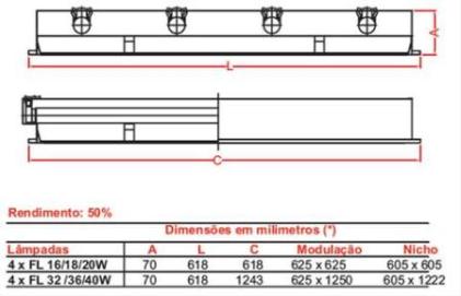 Corpo e refletor fabricado em chapa de aço tratada e pintura eletrostática a pó na cor branca, difusor em poliestireno leitoso/transparente, com soquetes em policarbonato anti-vibratório de engate rápido.